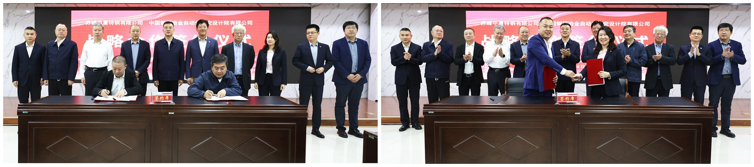 自动化院总经理杨光浩与中唐特钢副董事长马得红代表双方签订战略合作协议。中国钢研人工智能(工程)事业部(以下简称“智能部”)副总经理刘茹与中唐特钢总经理助理冯兰超签订《中唐特钢全流程智能管控项目》合同。